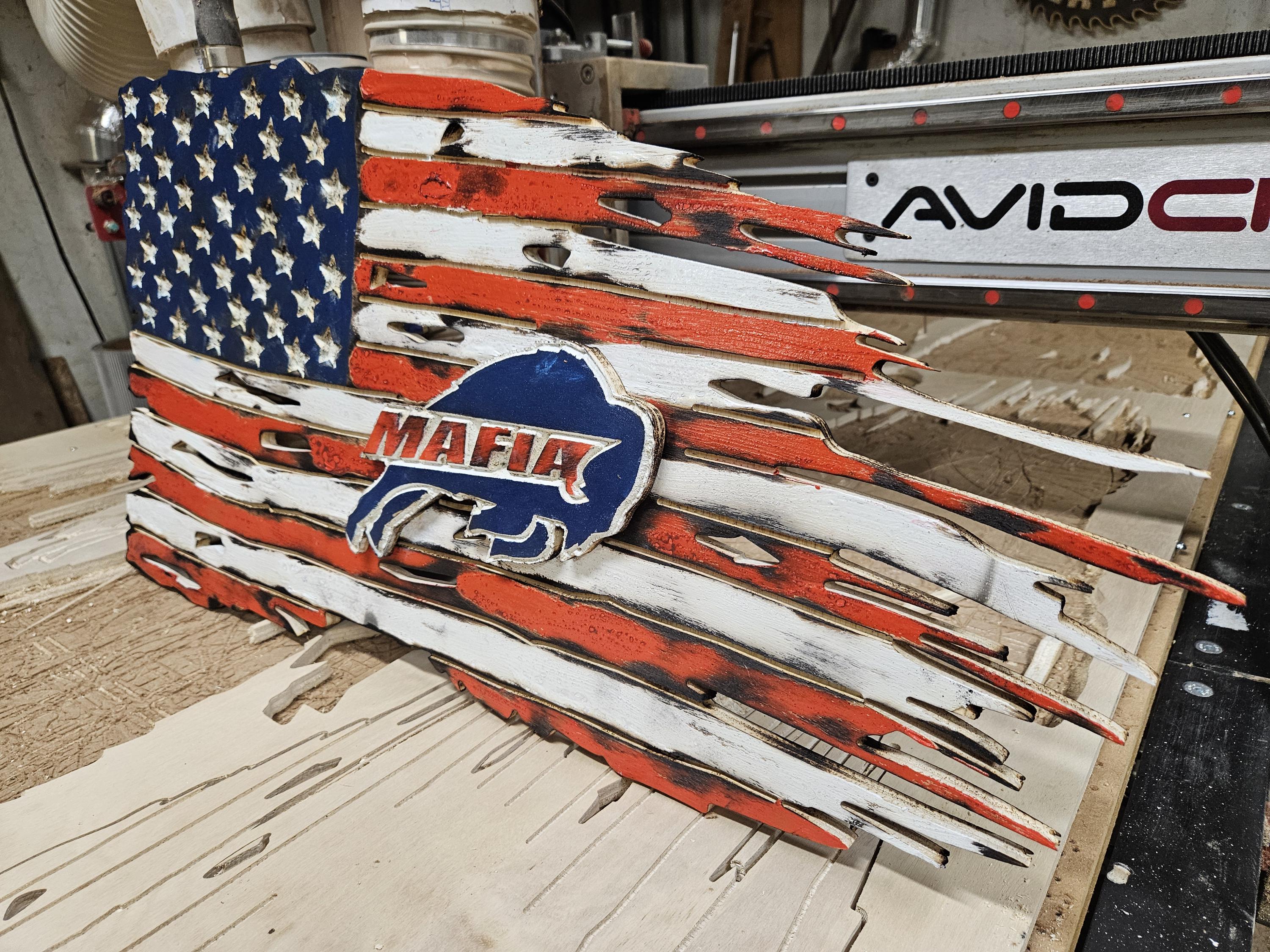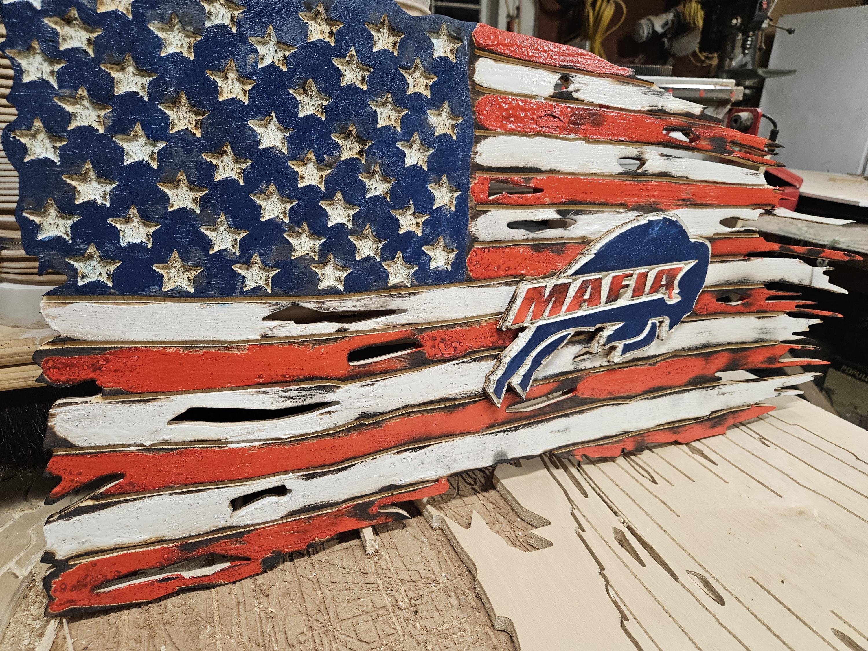 One of a kind Bills Mafia Wooden Tattered Flag. Each flag is hand painted and measures 15 1/2 inches by 30 inches. All our products are made by our small business in house near Buffalo NY and we are huge Bills fans!!! All details of the flag are carved into the flag and the logo is raised. Flags come finished with a clear coat and with a hanger on the back. FREE SHIPPING!!! Thank you for supporting our small business!!!!!